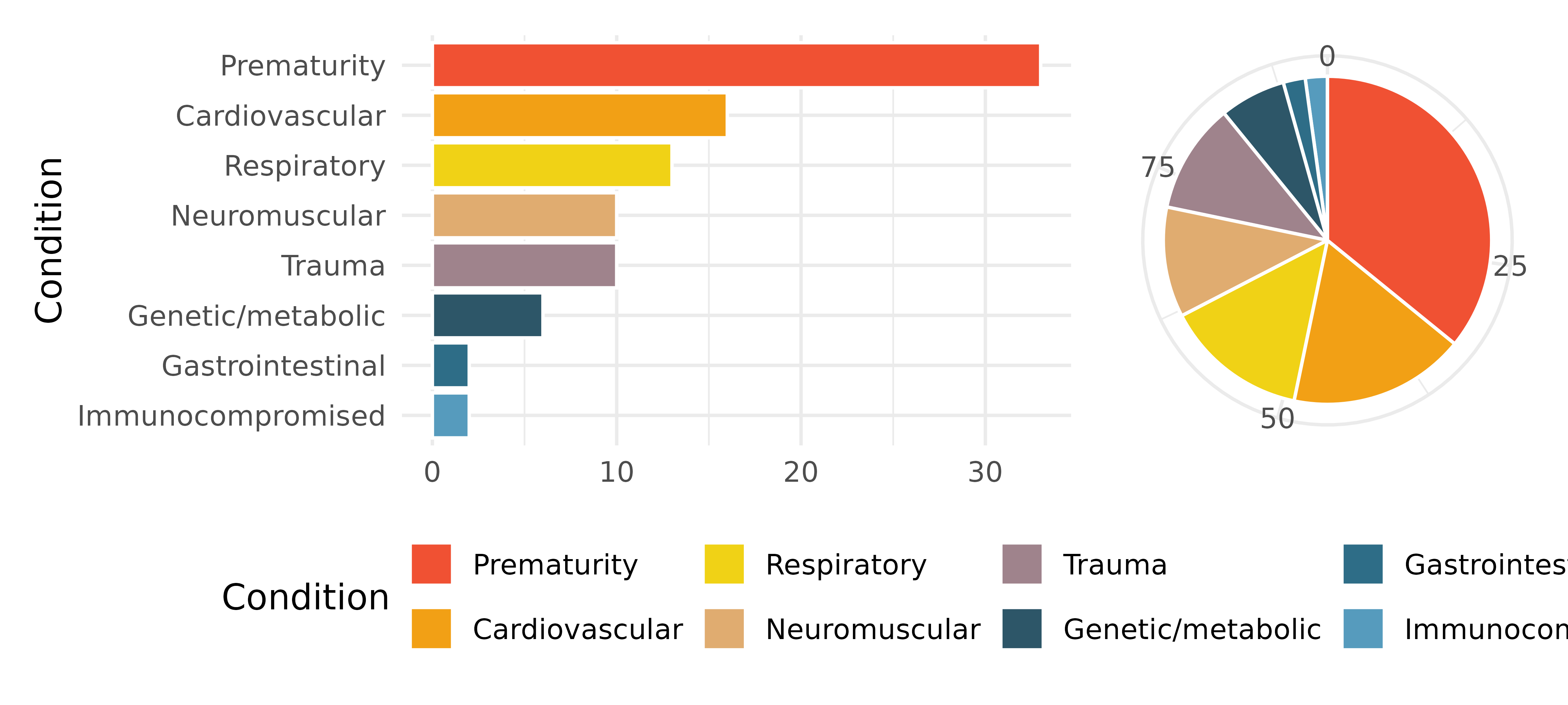 Antibiotic use in children. The bar plot and the pie chart below show the distribution of pre-existing medical conditions of children involved in a study on the optimal duration of antibiotic use in treatment of tracheitis, which is an upper respiratory infection.7