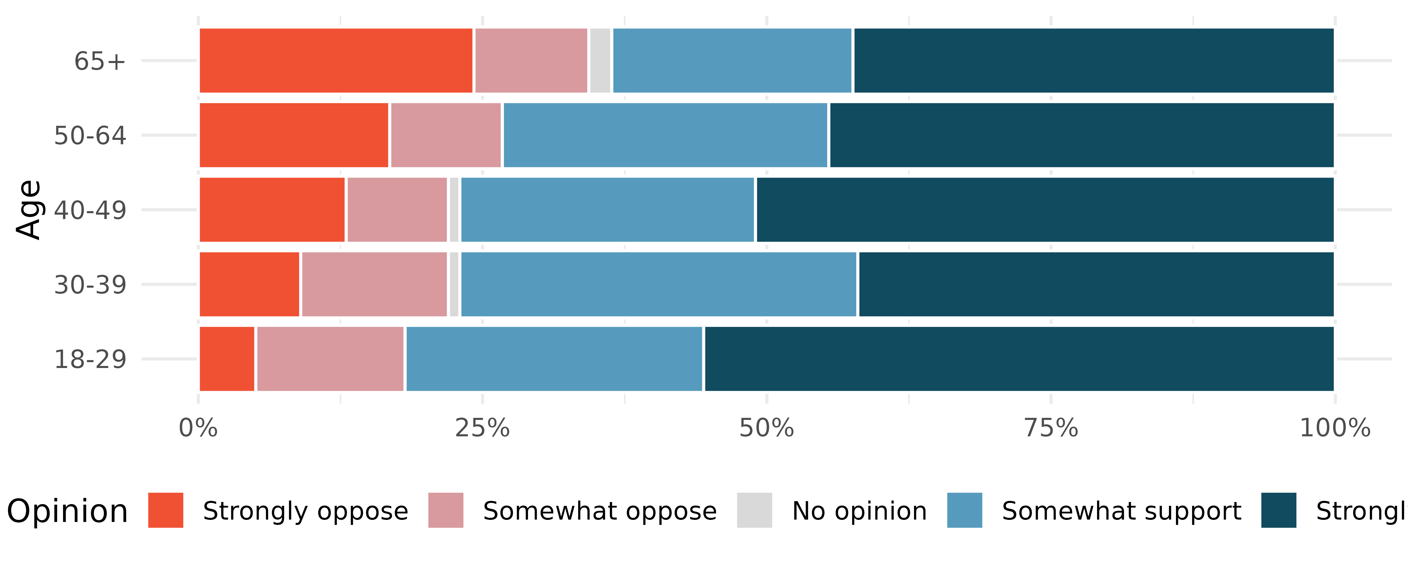 Black Lives Matter. A Washington Post-Schar School poll conducted in the United States in June 2020, among a random national sample of 1,006 adults, asked respondents whether they support or oppose protests following George Floyd’s killing that have taken place in cities across the US. The survey also collected information on the age of the respondents. (Washington Post 2020) The results are summarized in the stacked bar plot below.