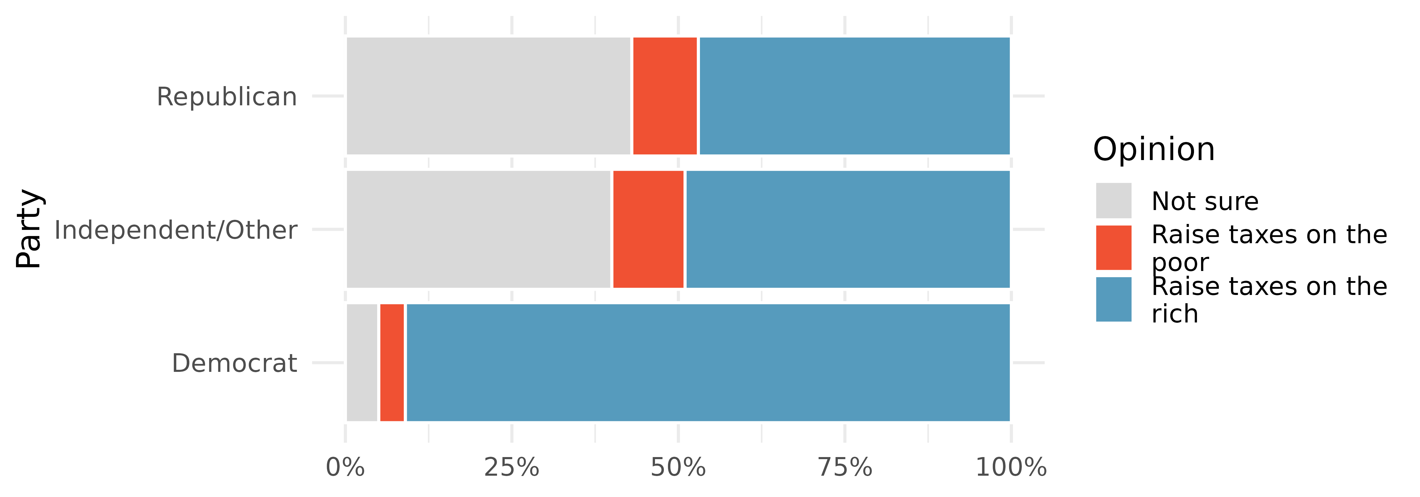 Raise taxes. A random sample of registered voters nationally were asked whether they think it’s better to raise taxes on the rich or raise taxes on the poor. The survey also collected information on the political party affiliation of the respondents. (Polling 2015)