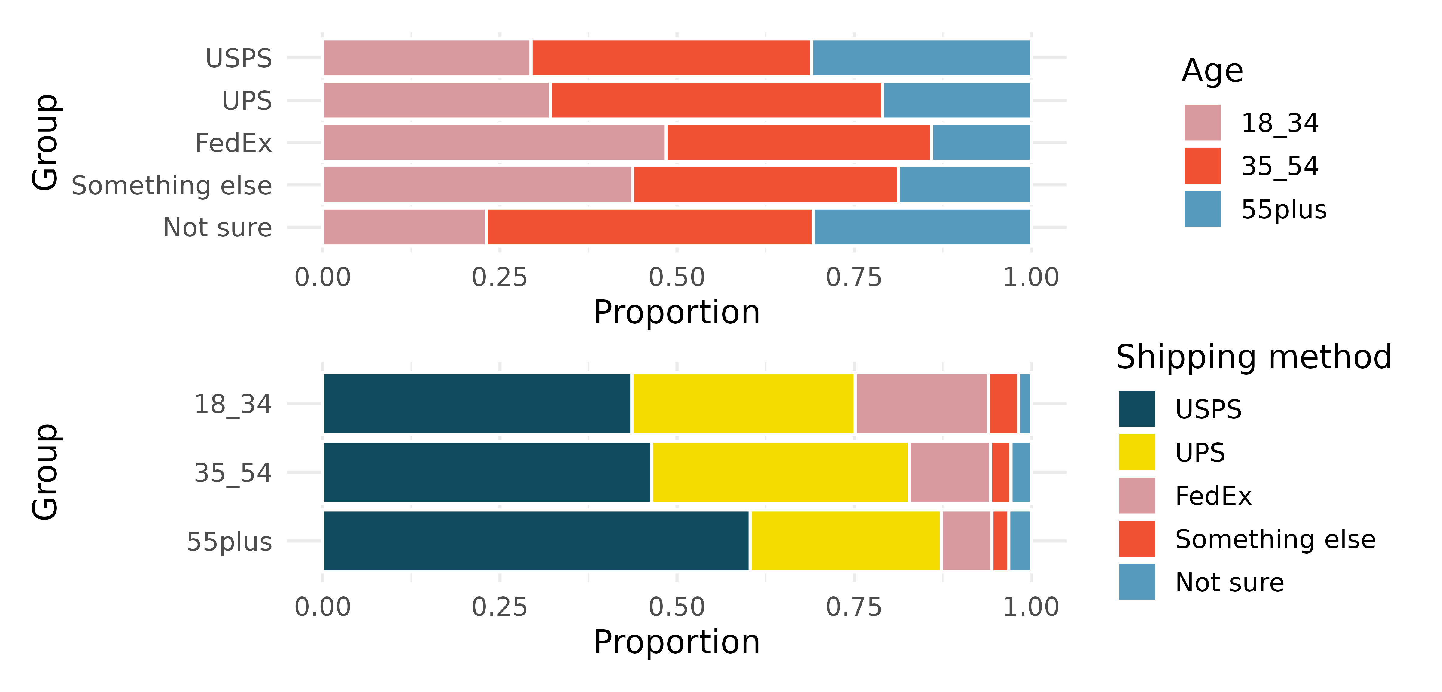 Shipping holiday gifts data display. A local news survey asked 500 randomly sampled Los Angeles residents which shipping carrier they prefer to use for shipping holiday gifts. The bar plots below show the distribution of responses by age group as well as distribution of responses by shipping method.